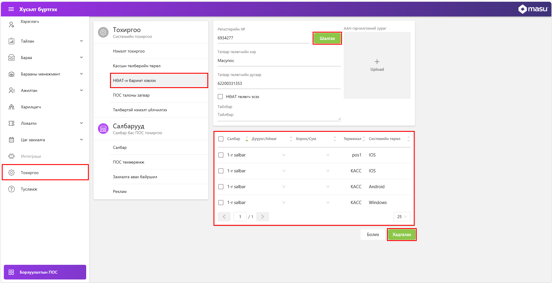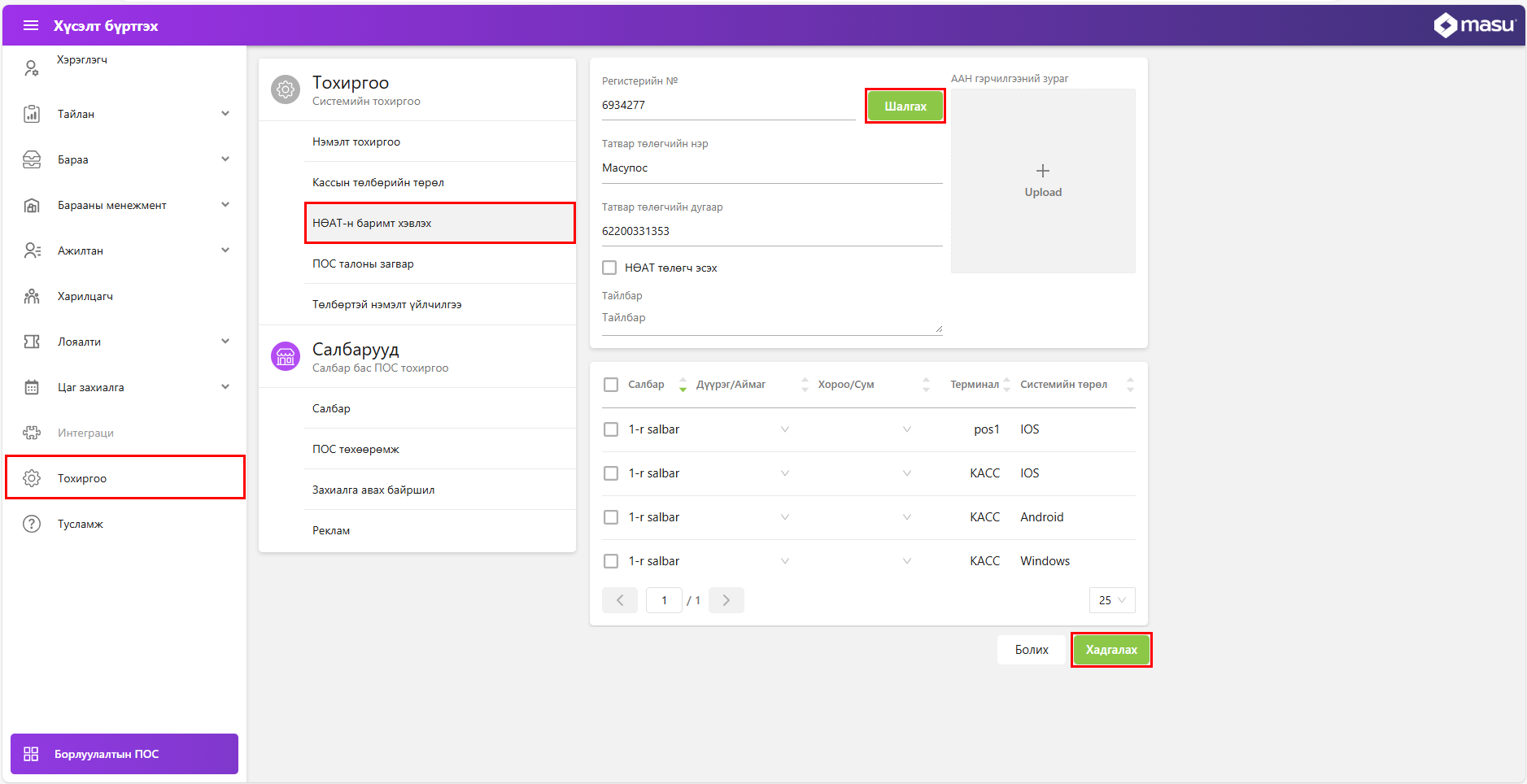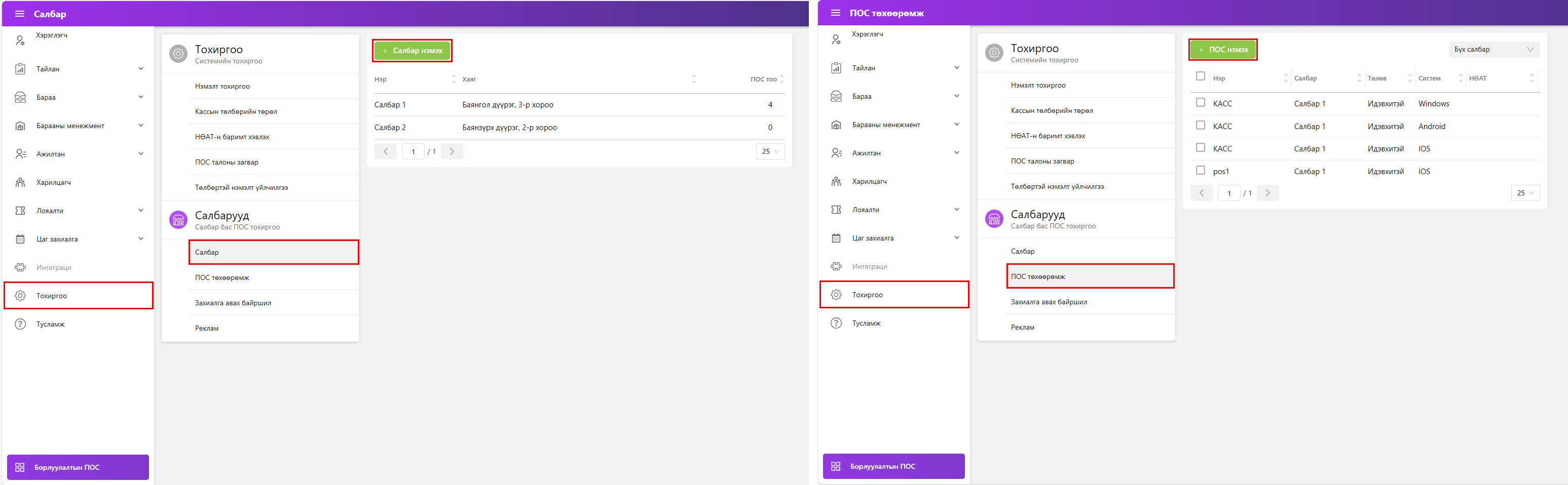Доод хэсэгт нь таны үүсгэсэн салбар, посууд орж ирсэн байна. Орж ирээгүй бол Салбар болон Пос-оо эхлээд бүртгэх шаардлагатай.