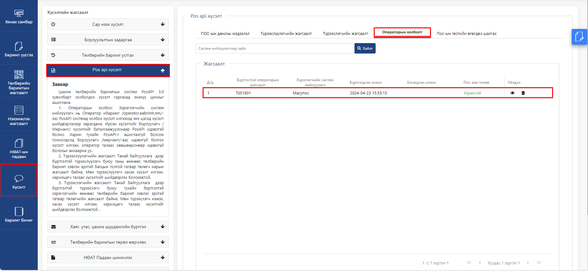 Бүртгэсэн хүсэлт жагсаалт дээр орж ирнэ. Үүний дараа манай ажилтан таны бүртгэлтэй утсаар холбогдон Пос програм суулгасан компьютерт хандан тохиргоо хийж өгөх юм. Хандаж тохиргоо хийхийн өмнө та компьютер дээрээ Anydesk програм татаж дугаарыг нь манай ажилтанд өгөх шаардлагатай.