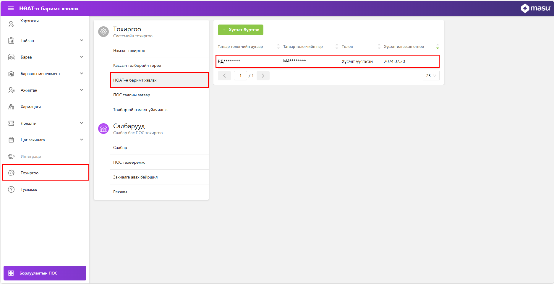 Тохиргоо хийсний дараа та нэвтрэлтийн нэгдсэн системээр ebarimt – рүү орж Хүсэлт – Pos api хүсэлт – Операторын холболт дотор Масупос-ыг идэвхжүүлнэ. Үүний дараа МасуПос-руугаа нэвтэрч орон борлуулалт бичихэд ebarimt-ын сугалааны дугаартай баримт гарч эхлэх юм.